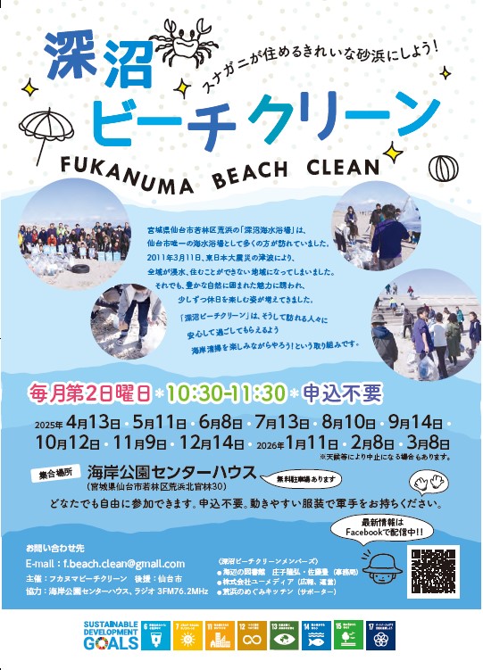 深沼ビーチクリーンとは、「深沼海水浴場をスナガニが住める美しい環境に」「裸足で歩ける砂浜を次世代につなごう」をテーマに訪れる人々に安心して過ごしてもらえるよう海岸清掃を楽しみながらやろう!という取り組みです。