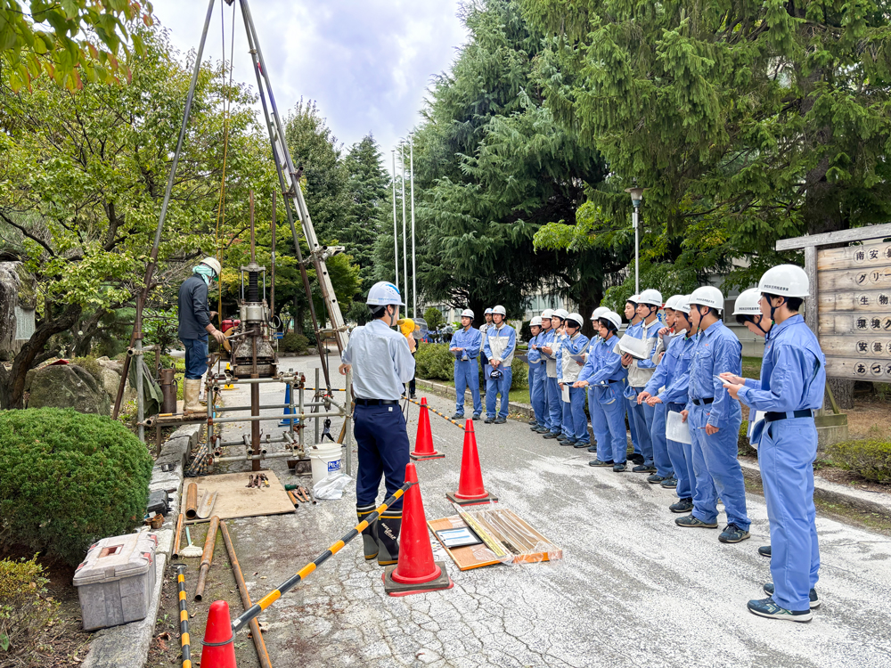 実習では、同校と当社、協力会社が連携し、ボーリング孔を活用した地質調査の基礎を学びました。 地質調査に用いられるボーリング孔の構造や仕組み、地盤の性質を確認する方法などを説明し、生徒たちは実際に地質サンプルを観察しながら、地盤調査の重要性や土木・建設分野で求められる技術の基礎について理解を深めました。