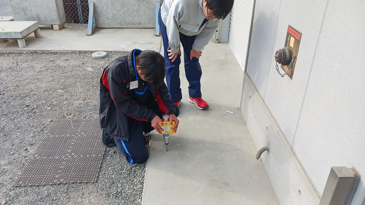 | インターンシップ 2日目(非破壊試験) | ・コンクリート試験室にて非破壊試験部の事業内容を学ぶ ・構造物の品質管理業務(テストハンマー試験)を体験 ・耐震診断調査業務(圧縮強度試験、中性化試験、鉄筋探査)を体験 ・試験結果より報告書作成 |