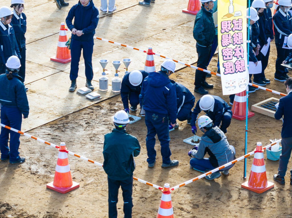 当日は、学生の皆さまに「現場密度試験」についてご紹介し、実際に現場での試験を体験していただきました。
