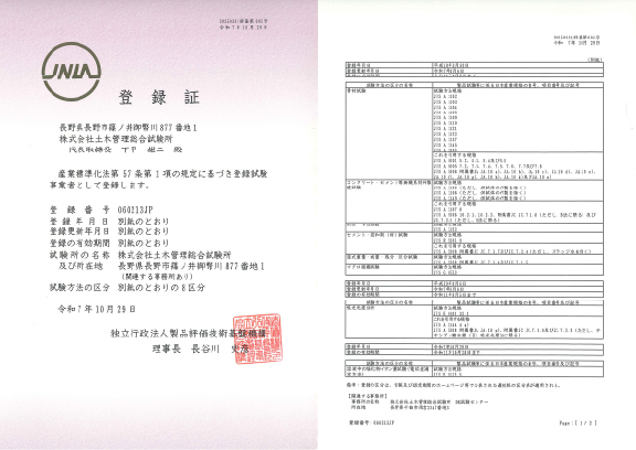 当社は、国際標準化機構及び国際電気標準会議が定めた試験所に関する基準(ISO/IEC17025)に適合する試験所として認められ、JNLA登録試験事業者としてマネジメントシステムを運営し、適格な試験ならびに結果を提供しています。当試験所は、産業標準化法試験事業者登録制度に基づく登録試験事業者で、試験結果には標章がついた試験証明書を発行することができます。