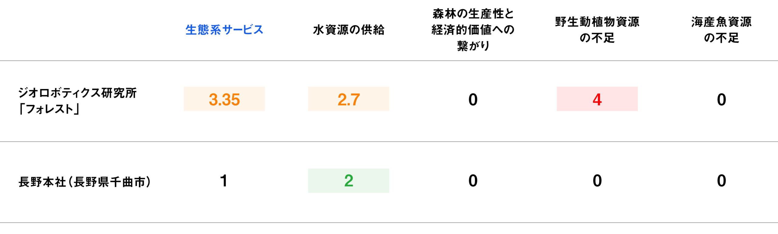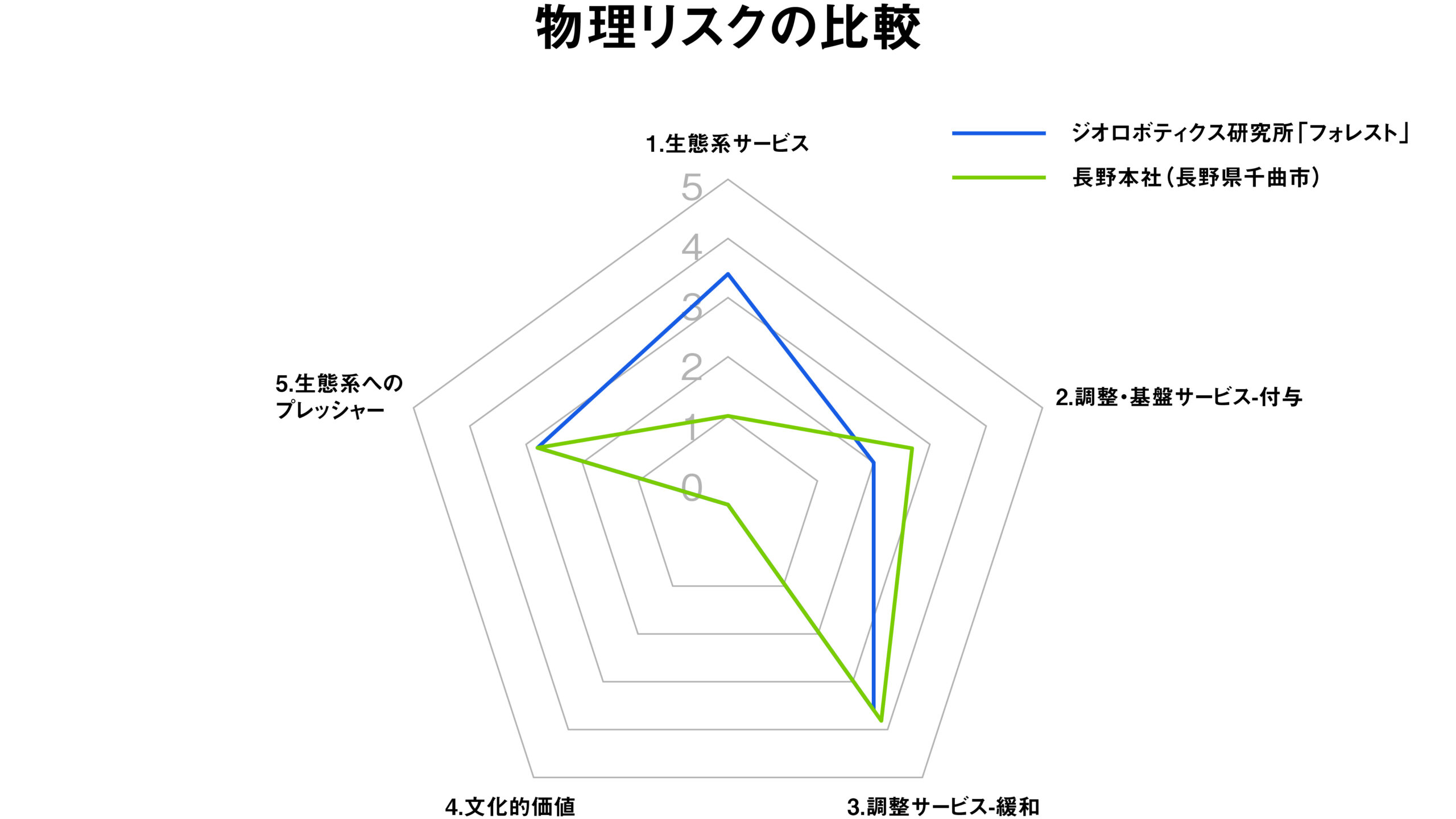 図3 ジオロボティクス研究所フォレストと長野本社の生態系サービスに関する物理リスクの比較(抜粋)。※リスクは0~5までの数値で表され、数字が大きいほどリスクが大きいとされる。